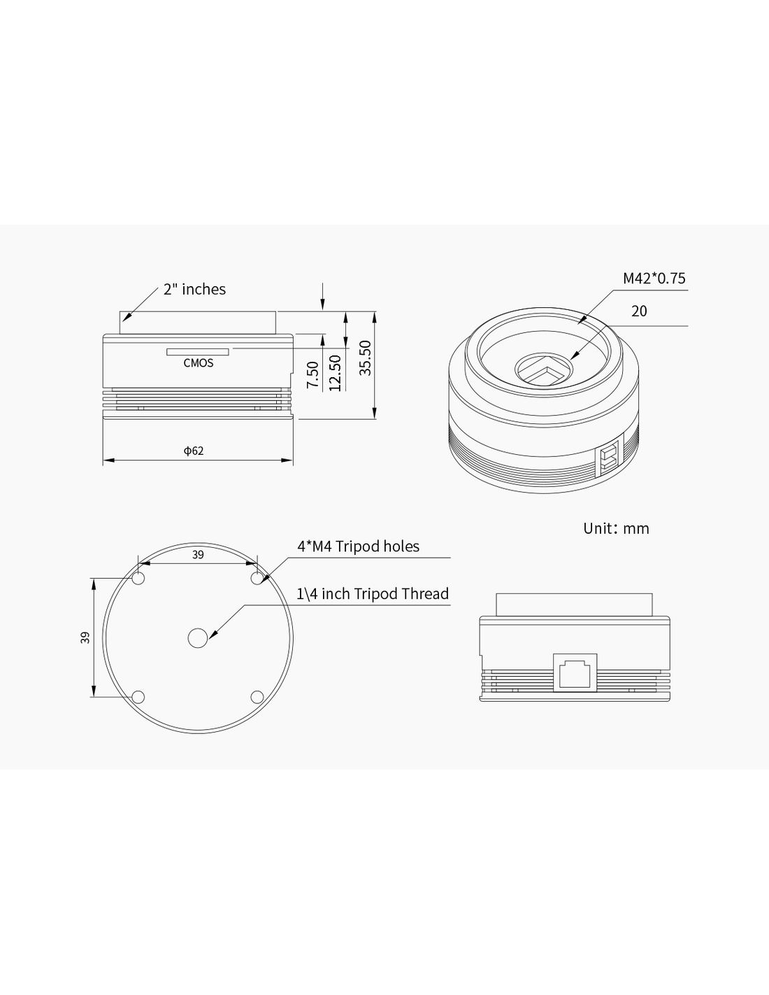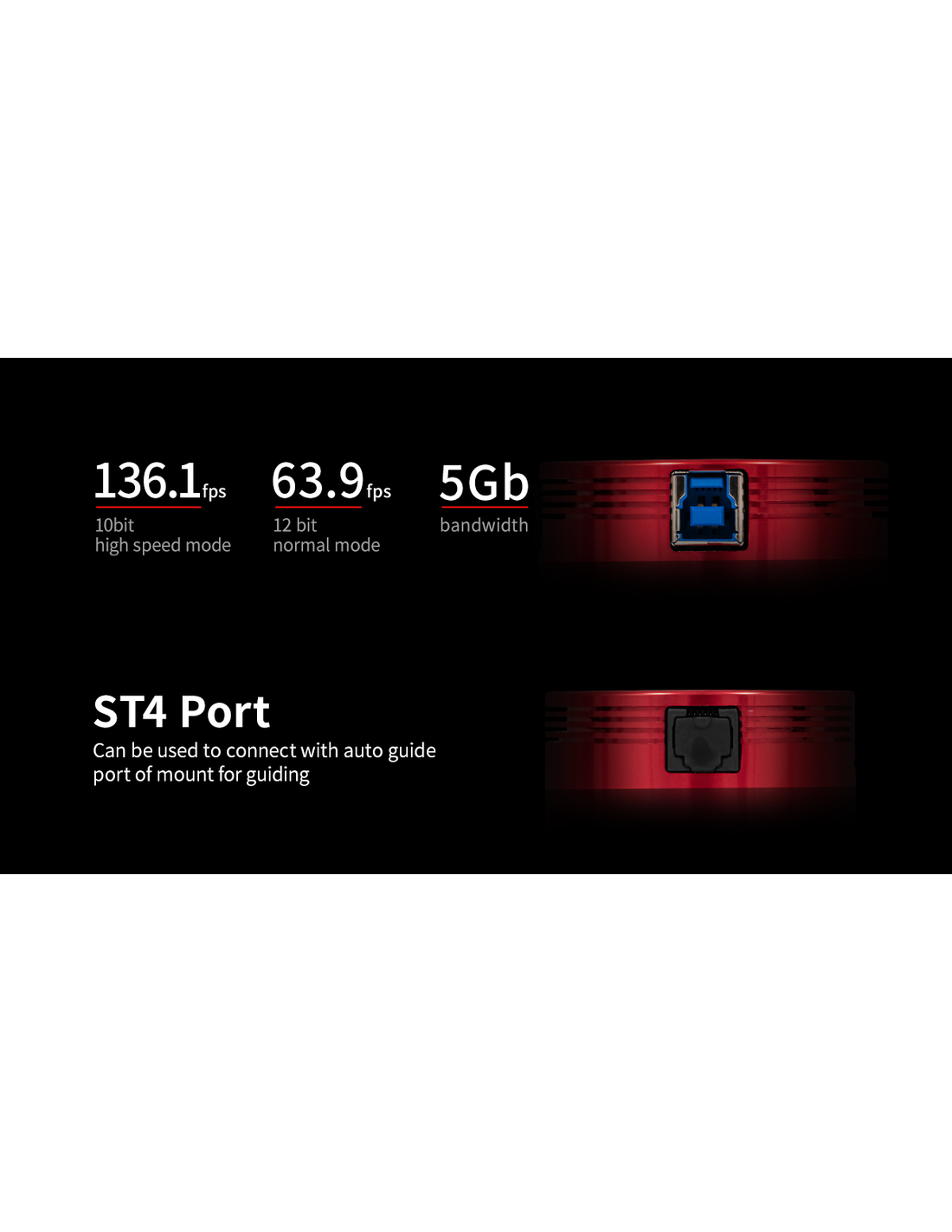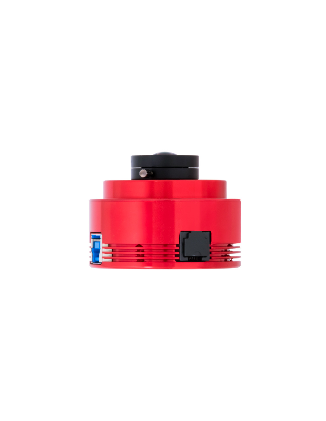 The ASI462MM has a robust and attractive CNC machined red-anodized aluminum body that stands up to heavy field use. An AR/IR-CUT glass window protects the sensor and helps keep images sharp. A 1/4-20 thread in the bottom of the camera makes it easy to attach the device to a camera tripod or mount, and four M4 threads along the outside edge offer additional mounting options. The camera also includes an ST4 Port and can be used as an effective autoguider.