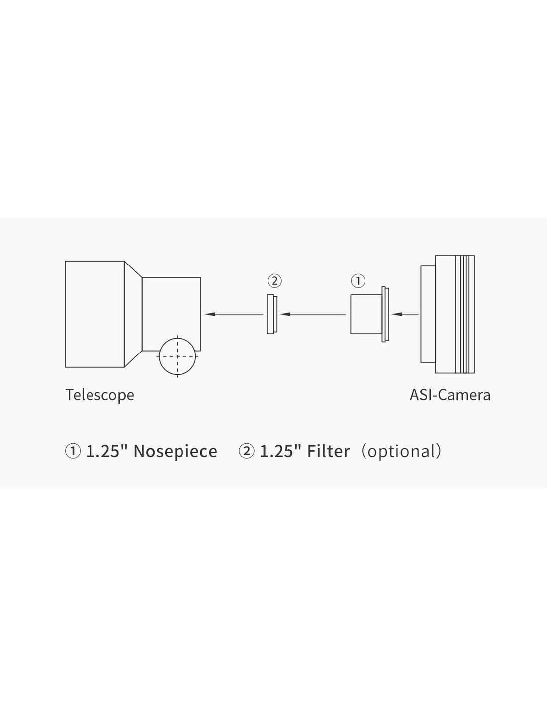 The camera body features a standard T/T2 female thread (M42x0.75) so that it can be directly connected to T-threaded accessories. Included is a 1.25"-T threaded nosepiece adapter that allows you to use the camera in standard 1.25" telescope focusers. The front of the camera also has a short (8mm long) 2" barrel that can be directly inserted into 2" telescope focusers. However, we recommend that use of a 2" T threaded prime focus adapter (not included) for a more robust connection to 2" telescope focusers.