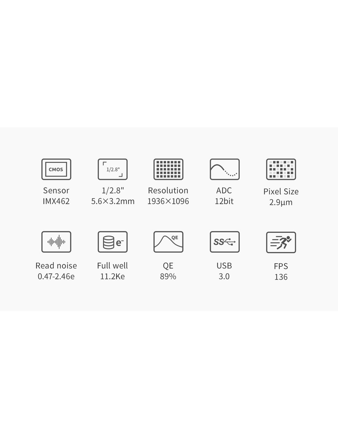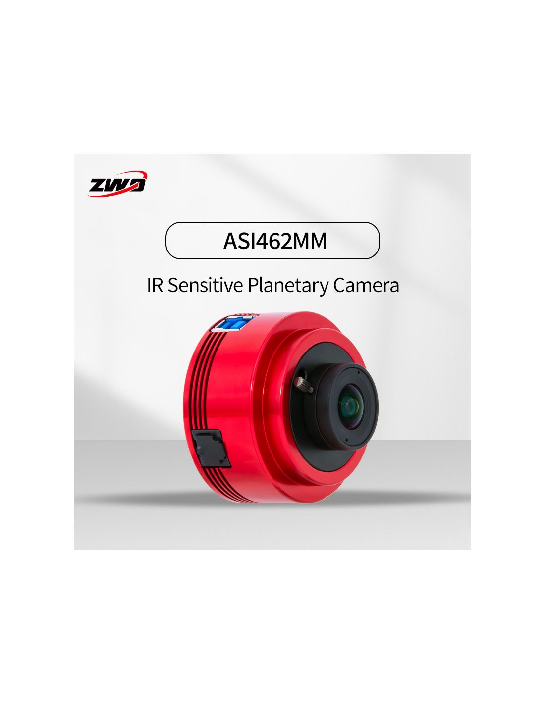 The successor to the renowned ZWO ASI290MM planetary camera, the ZWO ASI462MM is a sensitive and state-of-the-art monochrome astronomy camera with 2.1-megapixel resolution and USB 3.0 download speed. Built around the Sony IMX462 back-illuminated sensor, this advanced camera has a resolution of 1936x1096 with 2.9 μm pixel size and a read noise as low as 0.47e. This monochrome camera is ideal for high-resolution imaging of the Moon, Sun (with safe solar filter), and planets, and works well on small deep-sky objects as well. It features high quantum efficiency of up to 89% and enhanced sensitivity in the near infrared for imaging the moon and planets with IR filters.