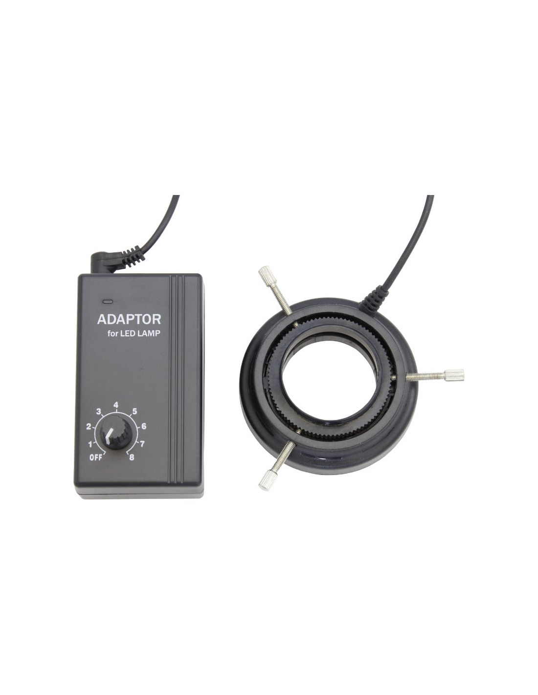 The intensity of illumination provided by the ring light can be easily adjusted via a dimmer control. This provdes stepless settings numbering from 1 to 8. The mains adaptor is a 90-260V AC/ 47-63Hz power supply with a European standard plug.