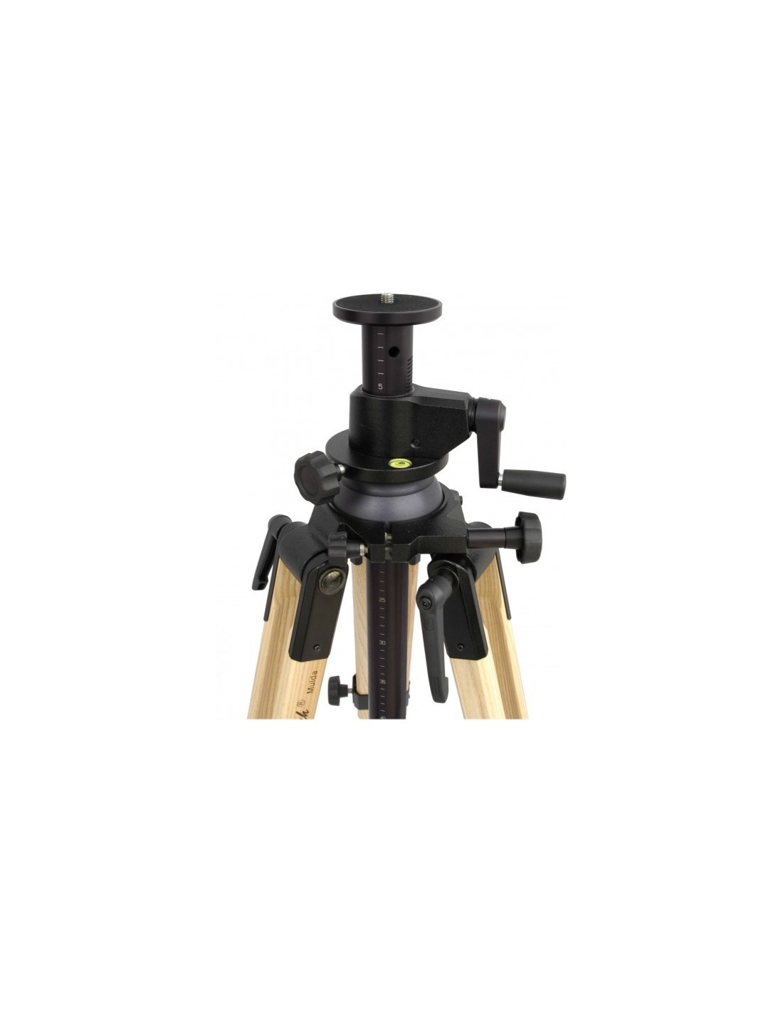Light-metal mounting head with levelling ball up to 30° tilt and circular bubble, and geared centre column. Centre column length is 50cm (39cm adjustment range) . Helical gearing on the centre column acts as an automatic column brake. Mounting plate diameter is 77 mm. Without leg spread stops. The maximum height given below is that an approx. 20° leg spread and with the centre column fully extended.