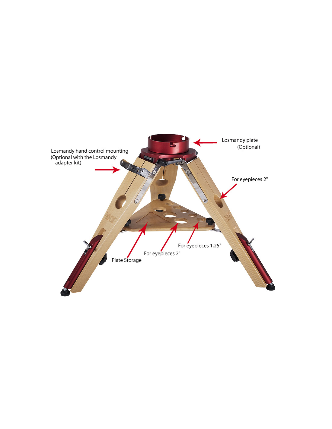 This tripod has a connection for mounts GK300, EQ6, Atlas, and adapters also GM8 Losmandy mounts, G11 (# 30H150) and HEQ5 (# 30A230)